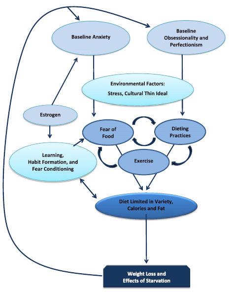 איור 1. מודל סכמתי של גורמים המשפיעים על פיתוח ותחזוקה של אנורקסיה נרבוזה (מתאים למודל המוצע על ידי שטיינגלאס ושות’ , 2011). תכונות אישיות כמו חרדה מורבידית ואובססיביות מגבירות את הפגיעות לאנורקסיה נרבוזה ומחריפות את הירידה במשקל. ישנה עליה באסטרוגן בתחילתן של הפרעות אכילה וגם בהפרעות חרדה ונמצאו ברמות גבוהות אצל נקבות. הטריגרים להתפרצותה של אנורקסיה נרבוזה מופעלים על ידי חשיפה לגורמים סביבתיים כולל מתח ולחץ סוציו-תרבותי לעשות דיאטה, מה שמוביל למעגל של הסלמה בדיאטה, פעילות גופנית וחרדה בנוגע לאכילה מחוזקות על ידי למידה, היווצרות הרגלים והתניית פחד. לאחר שהפרעה נהפכת לכרונית, ההשפעות של הרעב ורמות אסטרוגן נמוכות עלולות להשפיע על הלמידה והכחדת הפחד ובכך לתרום הן להמשכיות של הפחד מאוכל במהלך השלבים המוקדמים של שיחזור המשקל וגורמות לשיעורי התדרדרות גבוהים.