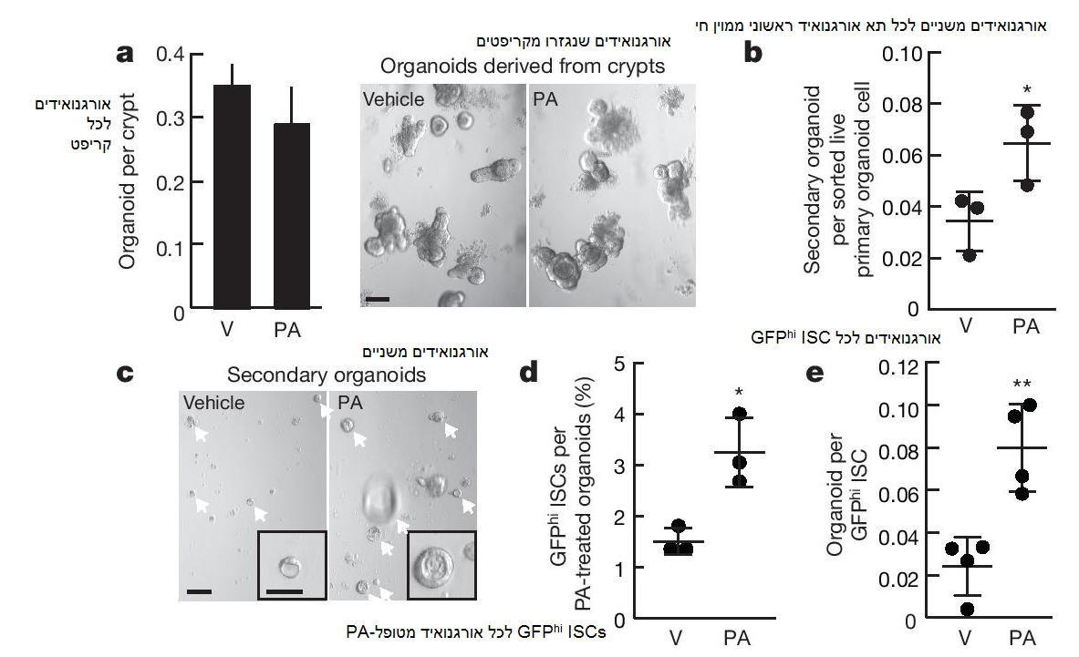 על מנת לבדוק האם הרכיבים הדיאטטיים של HFD יכולים לגרום לרקפיטולציה של אספקטים של פנוטיפ תאי הגזע שנגרם מ- HFD, הרחבנו את אורגנואידי הבקרה בתווך קריפטים בתוספת חומצה פלמיטית, רכיב עיקרי של HFD. הטיפול בחומצה הפלמיטית לא שינה את הפוטנציאל הקלונוגני של קריפטי הבקרה בתרבית הראשונית (איור 2a). עם זאת, בדומה לאורגנואידים מעכברי תזונת ה- HFD, האורגנואידים הראשוניים שנחשפו ex vivo לחומצה פלמיטית הציגו יותר אורגנואידים משניים בהשוואה לבקרה (איורים 2b, c, איור 5a extended data). באופן עקבי לממצאים אלו, האורגנואידים שטופלו עם חומצה פלמיטית כללו כמעט פי 2 יותר Lgr5+ ISCs (איור 2d, איור 5b extended data), והפגינו תלות מופחתת בנישה בהליך האורגנואידים (איור 2e). תוצאות דומות הושגו עם חומצות שומן אחרות כמו חומצה אולאית ותערובת ליפיד באורגנואידים אינטסטינליים של עכברים ובני אדם (איור 3h-k, איור 5c-f extended data). ממצאים אלו מלמדים כי רכיבי דיאטה עיקריים של HFD הינם מספקים בכדי ליצור רקפיטולציה של אספקטים של פנוטיפ תאי הגזע של HFD in vivo.