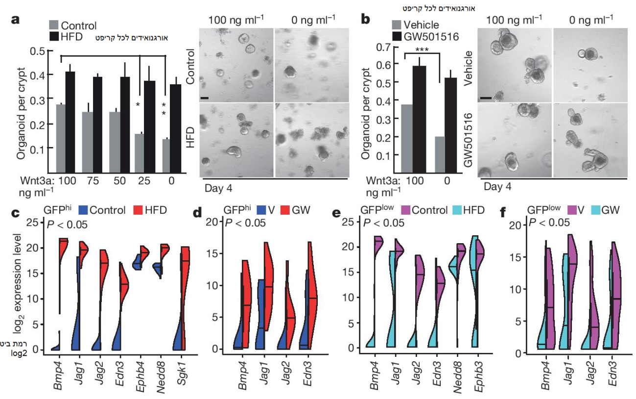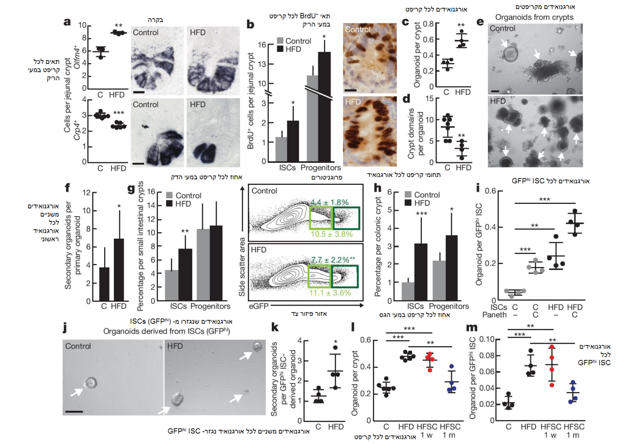 בהתחשב בכך שהמספר והשגשוג של ISC גדלים ב- HFD (איור 1b, איורים 1h-k ו- 3f extended data ומידע נספח), בדקנו האם HFD מגבירה בנוסף את הרגנרציה של המעיים. באמצעות גישת in vitro, בחנו את היכולת של קריפטים אינטסטינליים מבודדים ליצור גופים אורגנואידיים בתרבית 3D. אורגנואידים אלו מובילים לרקפיטולציה של הארכיטקטורה האפיתליאלית והמגוון התאי של מעי יונקים ומשמשים כפרוקסי של פעילות ISCs, מכיוון שרק תאי גזע מסוגלים לאתחל ולשמר תאים אלו לטווח הארוך. קריפטים נגזרי-HFD מהמעי הדק והמעי הגס הפגינו סבירות גבוהה יותר לאתחל mini-intestines בתרבית, בהשוואה לאלו מהבקרה (איורים 1c, e, ואיור 3j extended data). בנוסף, אורגנואידים אלו היו ציסטיים יותר (כלמור, פחות ממוינים) במבנה שלהם והכילו פחות תחומי קריפטים (איור 1d). לאחר sub-cloning, אורגנואידים ראשוניים נגזרי-HFD חוללו יותר אורגנואידים משניים (איור 1f, איור 3k extended data). באופן עקבי לממצאים אלו, אורגנואידים נגזרי-קריפט של HFD הפגינו תדירות גבוהה יותר של Lgr5+ ISCs בהשוואה לבקרה (איורים 4a, d, e extended data), וכללו סוגי תא אינטסטינליים מגוונים, כמו תאי פאנט, ISCs, תאים אנטרואנדוקריניים ותאי גביע (איורים 4b-f extended data).