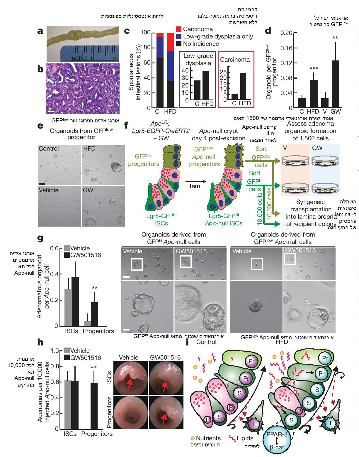 תאי גזע סומאטיים לעתים קרובות צוברים את המוטציות הראשוניות המובילות לשינויים אונקוגניים. מצאנו כי ב- HFD ישנה שכיחות גדולה יותר במעיים של לזיות דיספלסטיות ספונטניות ברמה נמוכה (אדנומות), קרצינומות, או שתיהן, בהשוואה לבקרה (איורים 5a-c), נתון שעשוי לשקף את העובדה כי קיימים יותר ISCs בעכברי HFD המסוגלים לרכוש מוטציות אונקוגניות. מכיוון ש- PPAR-δ בהשראת-HFD גורם בנוסף לאקטיבציה של חתימת β-catenin בתאים פרוגניטוריים, הצענו כי אוכלוסיות פרוגניטורים non-ISCs יכולות לרכוש תכונות של תאי גזע ולתרום לאתחול גידולים במקרים של השמנת יתר הנגרמת מדיאטה. כדי לבחון אפשרות זו, בדקנו האם HFD או PPAR-δ מופעל-אגוניסט השפיעו על יכולת אתחול האורגנואידים של הפרוגניטורים (non-ISC). מעניין לציין כי פרוגניטורים Lgr5-GFPlow, אך לא אנטרוציטי villous ממוינים טרמינאלית, מעכברי HFD ועכברי PPAR-δ מטופל-אגוניסט יצרו אורגנואידים (איורים 5d, e, ואיורים 4g, 7a, b extended data), ממצא המצביע על האפשרות כי איתות PPAR-δ כפוי בפרוגניטורים אינטסטינליים לא רק מעניק יכולת אתחול אורגנואידים אלא גם פוטנציאל אתחול גידולים.